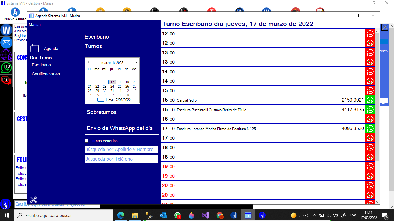 Vista de Agenda de Vencimientos, Mensajería y Turnos.